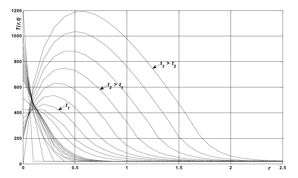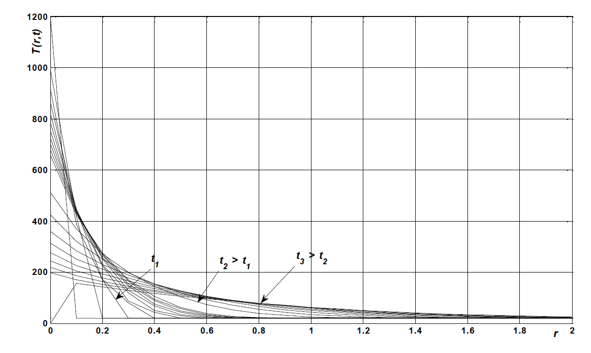 - Распространение теплового фронта от источника горения (r = 0) для материалов с высоким порогом возгорания