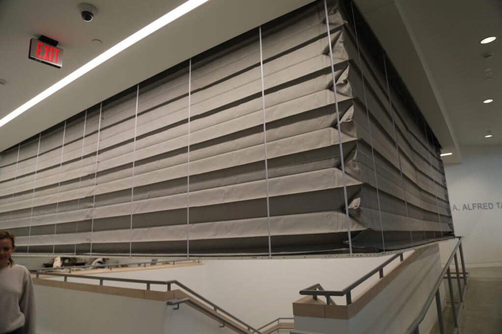 Преимущественно вдоль путей эвакуации устанавливаются противодымные шторы с программируемым опусканием полотна на высоту (высоты) ниже дымового слоя, рассчитываемую по пожарной нагрузке пожарного отсека, секции, пространства. Для эскалаторов, транспортеров, выделения путей эвакуации в больших пространствах могут использоваться модульные и объемно-пространственные решения противопожарных штор с установленным СП и No123-ФЗ пределом огнестойкости.